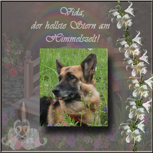 Hallo liebe Vida, ich hoffe es geht Dir gut dort oben im Regenbogenland.Mach Dir keine Sorgen,denn hier unten passen wir auch mit auf Dein Frauchen auf. Liebe Grüße von Kirsten mit ihren 4 Lieblingen