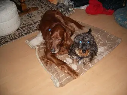 Dieses Foto wurde an dem Tag gemacht, an dem wir uns von Atilla verabschieden mussten. Atilla war 11 Jahre älter als der kleine Dackel und hatte zunächst große Schwierigkeiten den Neuankömmling zu akzeptieren. In der letzten Woche wich der kleine jedoch nicht mehr von Atillas Seite. Er beobachtete ihn saß oder lag ganz eng an ihn gekuschelt und es war als ob er ihn vor irgendetwas beschützen oder ihn auf diesem Gang begleiten wollte. Auch wenn Atilla nie ersezt werden kann und ich ihn immernoch und wahrscheinlich für immer vermissen werde, gibt Gonzo der FAmilie Kraft und erfüllt das haus weiterhin mit Leben!!